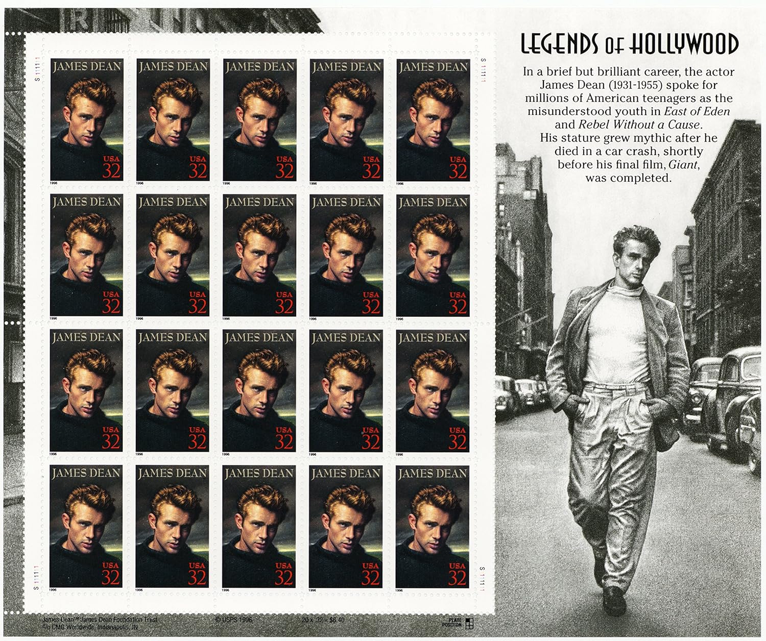 Amazon Com James Dean Legends Of Hollywood Full Sheet Of 20 X 32 Cent Postage Stamps Usa 1996 Scott 3082 Toys Games